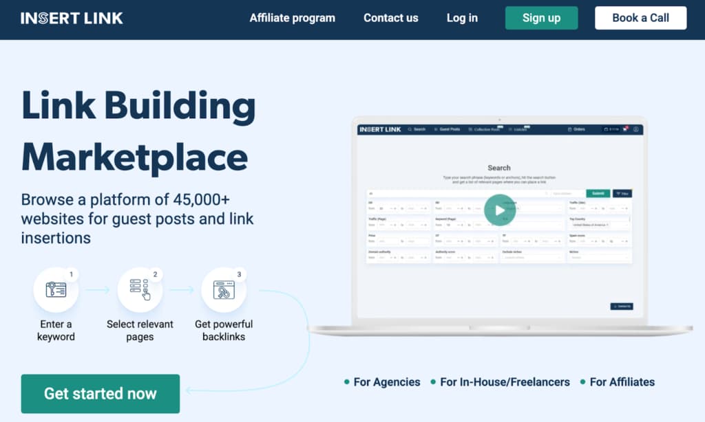 INSERT.LINK is a link building marketplace that approaches competitor analysis differently. Most gap tools show you competitor domains. INSERT.LINK shows you competitor pages. You enter a keyword your rival ranks for. The platform returns specific articles where you could insert a link.